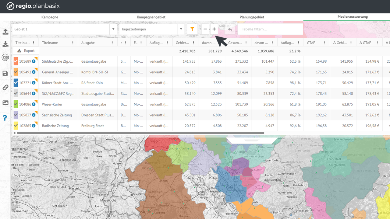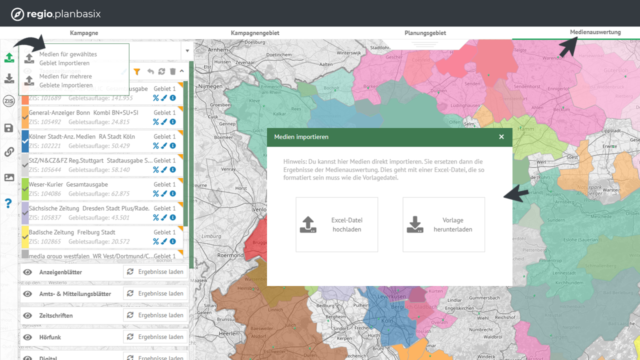 So kannst du beliebig zusammengestellte Titellisten – etwa aus ZIS, einer Agentur oder eigener Recherche – mit deinen in regio.planbasix definierten Planungsgebieten verknüpfen und direkt auswerten. Externe Medienauswahl und eigene Gebietsplanung greifen damit noch besser ineinander.