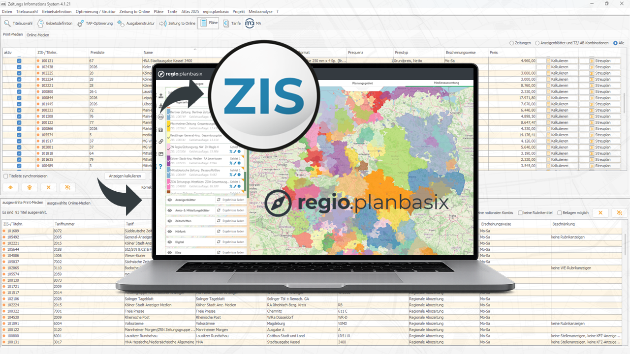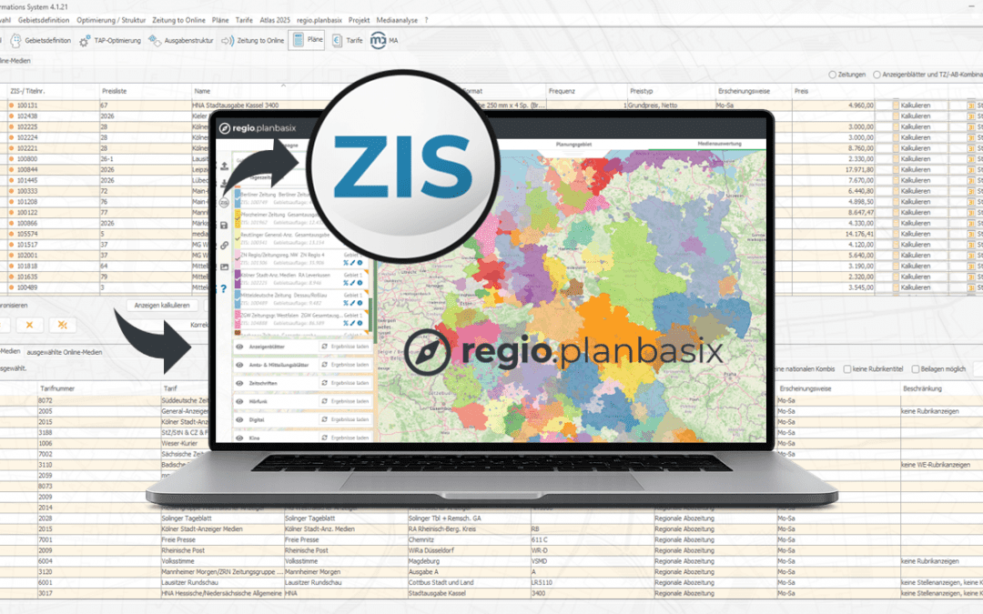 Gebietsdefinitionen und Mediensets lassen sich jetzt noch reibungsloser von regio.planbasix an ZIS übergeben. Besonders stark ist die Erweiterung des ViewerLink: ZIS-Nutzer können damit jetzt direkt aus der Planungssoftware heraus auf die Kartographie von regio.planbasix zugreifen – ohne Umweg, ohne Brüche im Workflow.